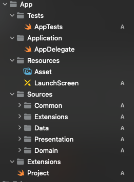 Clean architecture의 기본 레이어인, Domain, Data, Presentaion Layer로 그룹을 만들어주고, 추가로 Extensions, Common 그룹을 만들어준다.
